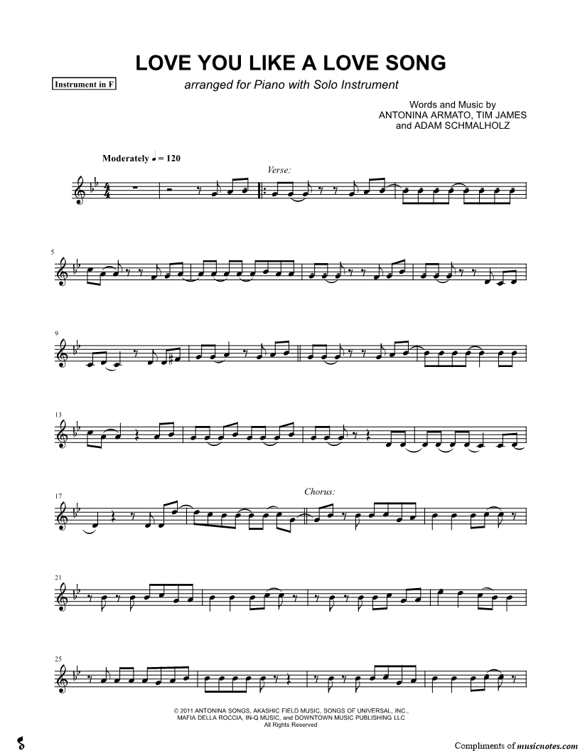 1. Love You Like a Love Song - F Instrument (click here to preview and play this piece) Performer: Composers: Lyricists: Scored For:Instrumental Part and Instrumental Solo Instrument:F Instrument, range: C4-G5 Number of pages:2 Click here to purchase this piece separately for $4.99 |
