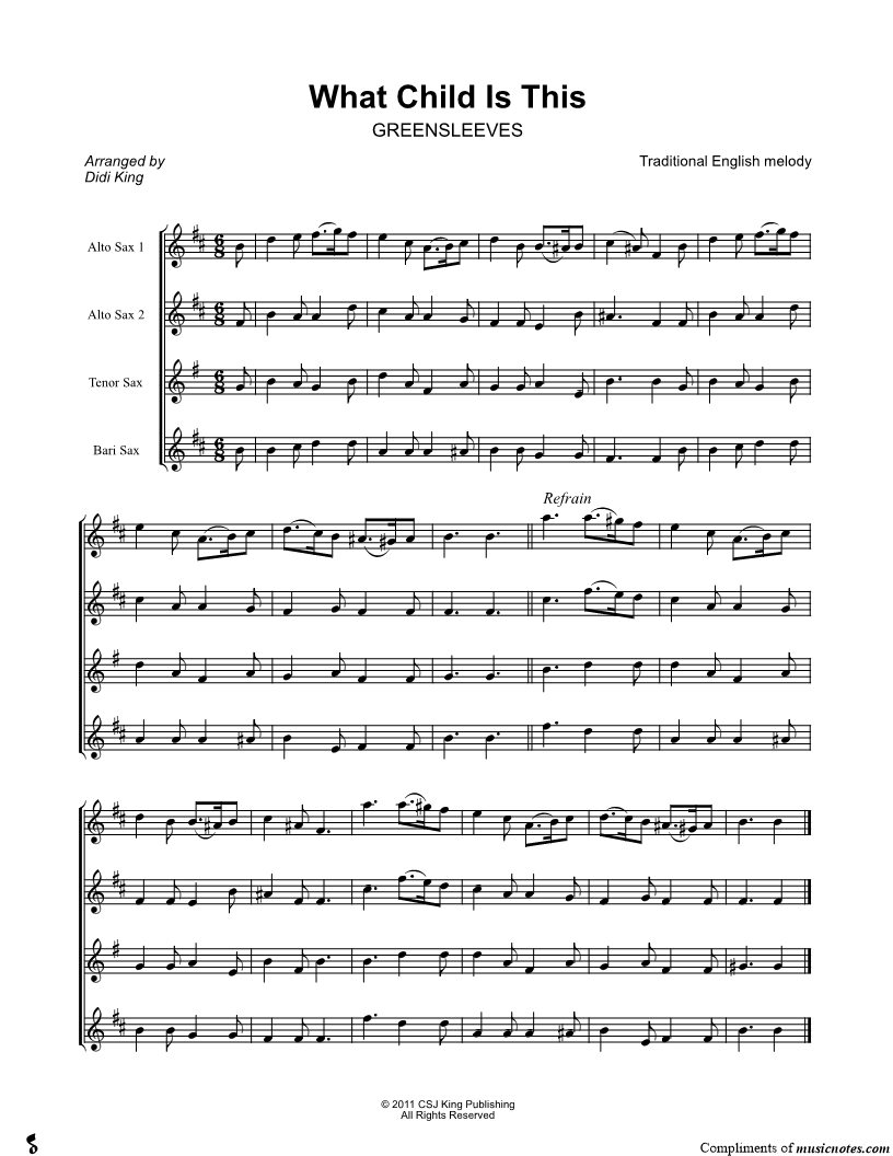 1. What Child Is This? - Saxophone Quartet Score (click here to preview and play this piece) Composer: Lyricist: Scored For:Saxophone Quartet and Score Instruments:Alto Saxophone 1, range: F#4-A5, Alto Saxophone 2, range: E4-F#5, Tenor Saxophone, range: E4-D5 and Baritone Saxophone Number of pages:1 Click here to purchase this piece separately for $4.99 |