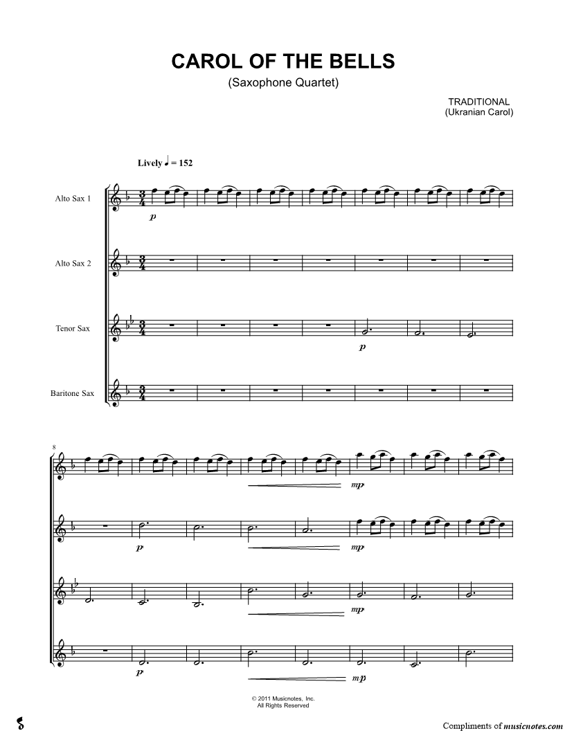 1. Carol of the Bells - Saxophone Quartet Score (click here to preview and play this piece) Composer: Lyricist: Scored For:Saxophone Quartet and Score Instruments:Alto Saxophone 1, range: D4-A5, Alto Saxophone 2, range: Bb3-F5, Tenor Saxophone, range: Bb3-G5 and Baritone Saxophone Number of pages:3 Click here to purchase this piece separately for $5.79 |