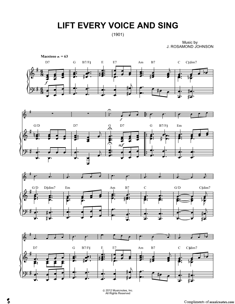 1. Lift Every Voice and Sing - Piano Accompaniment (click here to preview and play this piece) Composer: Lyricist: Scored For:Solo & Accompaniment and Instrumental Part Instruments:Piano Accompaniment, C Instrument, range: B3-E5, Violin, Oboe, Flute and Recorder Number of pages:2 Click here to purchase this piece separately for $5.99 |