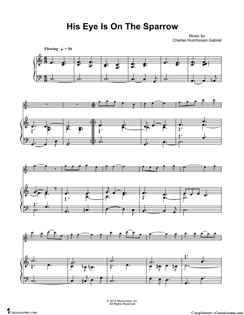1. His Eye Is on the Sparrow - Piano Accompaniment (click here to preview and play this piece) Composer: Lyricist: Scored For:Solo & Accompaniment and Instrumental Part Instruments:Piano Accompaniment, C Instrument, range: C5-E6, Violin, Oboe, Flute and Recorder Number of pages:2 Click here to purchase this piece separately for $5.99 |
