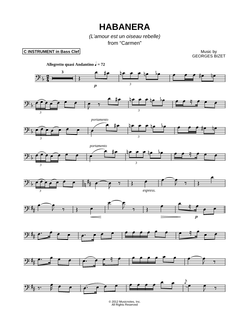 1. Habanera - Bass Clef Instrument (click here to preview and play this piece) Composer: Lyricists: Scored For:Instrumental Solo and Instrumental Part Instruments:Tuba, Bass Clef Instrument, Cello, Double Bass, Trombone, Bassoon and Baritone Horn Number of pages:2 Click here to purchase this piece separately for $4.99 |