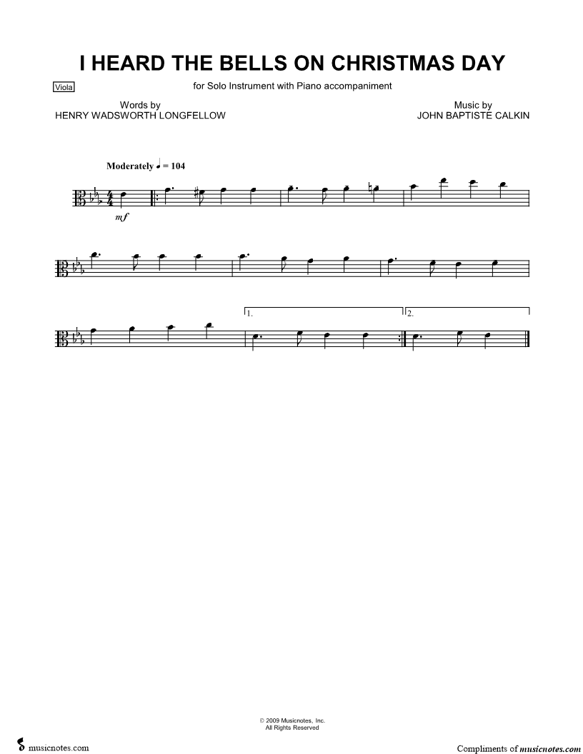 1. I Heard the Bells on Christmas Day - Viola (click here to preview and play this piece) Composer: Lyricist: Scored For:Instrumental Part and Instrumental Solo Instrument:Viola, range: D4-Eb5 Number of pages:1 Click here to purchase this piece separately for $4.99 |