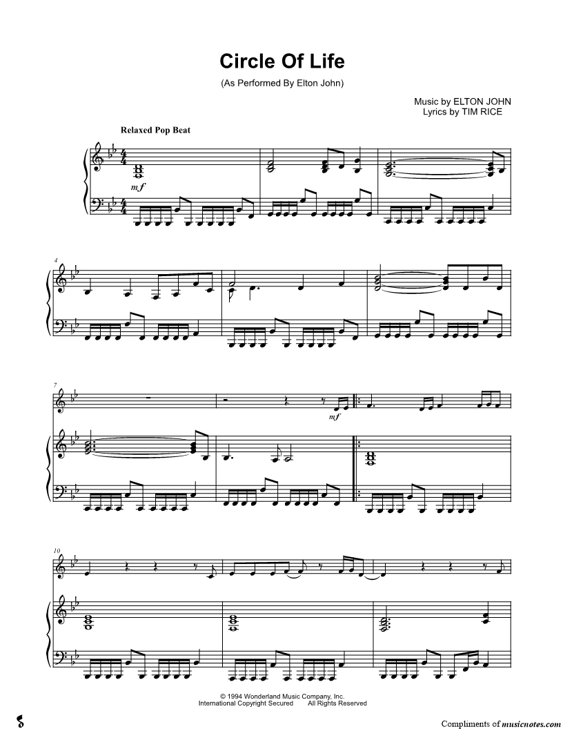 1. Circle of Life (Pop Version) - Piano Accompaniment (click here to preview and play this piece) Performer: Composer: Lyricist: Scored For:Instrumental Parts and Solo & Accompaniment Instruments:Piano Accompaniment, C Instrument, range: C4-F5, Violin, Oboe, Flute and Recorder Number of pages:4 Click here to purchase this piece separately for $4.99 |