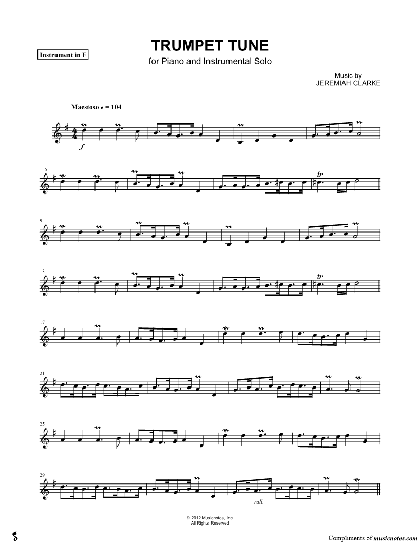 1. Trumpet Tune - F Instrument (click here to preview and play this piece) Composer: Scored For:Instrumental Solo Instrument:F Instrument, range: B3-E5 Number of pages:1 Click here to purchase this piece separately for $4.99 |