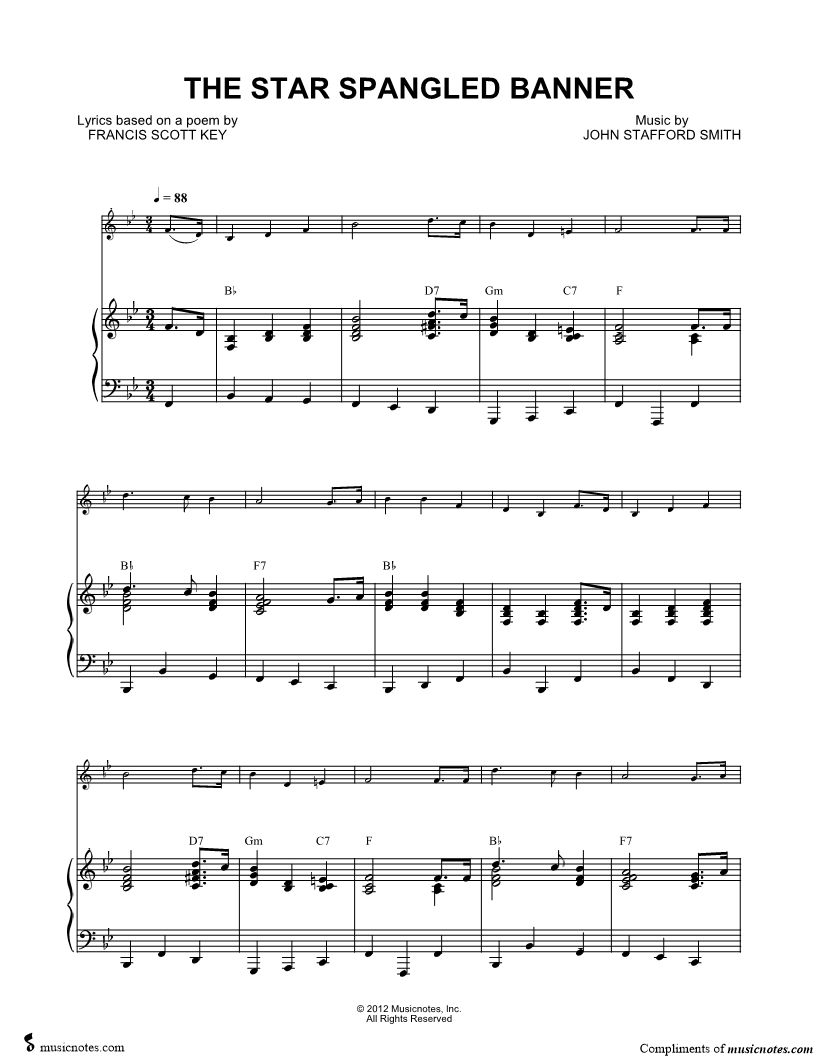 1. The Star-Spangled Banner - Piano Accompaniment (click here to preview and play this piece) Composer: Lyricist: Scored For:Instrumental Part and Solo & Accompaniment Instruments:Piano Accompaniment, C Instrument, range: Bb3-F5, Violin, Oboe, Flute and Recorder Number of pages:2 Click here to purchase this piece separately for $5.99 |