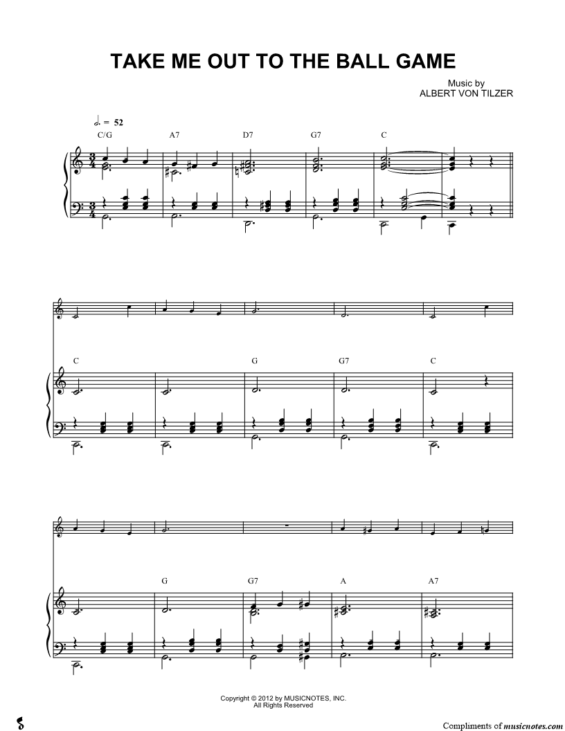 1. Take Me Out to the Ball Game - Piano Accompaniment (click here to preview and play this piece) Composer: Lyricist: Scored For:Instrumental Solo and Instrumental Part Instruments:Piano Accompaniment, C Instrument, range: C4-D5, Violin, Oboe, Flute and Recorder Number of pages:2 Click here to purchase this piece separately for $5.99 |