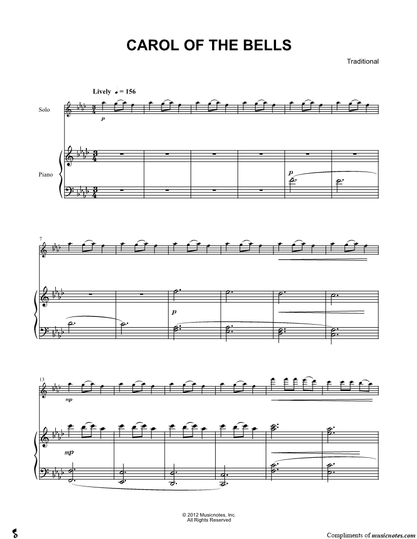 1. Carol of the Bells - Piano Accompaniment (click here to preview and play this piece) Composer: Lyricist: Scored For:Solo & Accompaniment and Instrumental Parts Instruments:Piano Accompaniment, C Instrument, range: F4-F6, Violin, Oboe, Flute and Recorder Number of pages:3 Click here to purchase this piece separately for $4.99 |