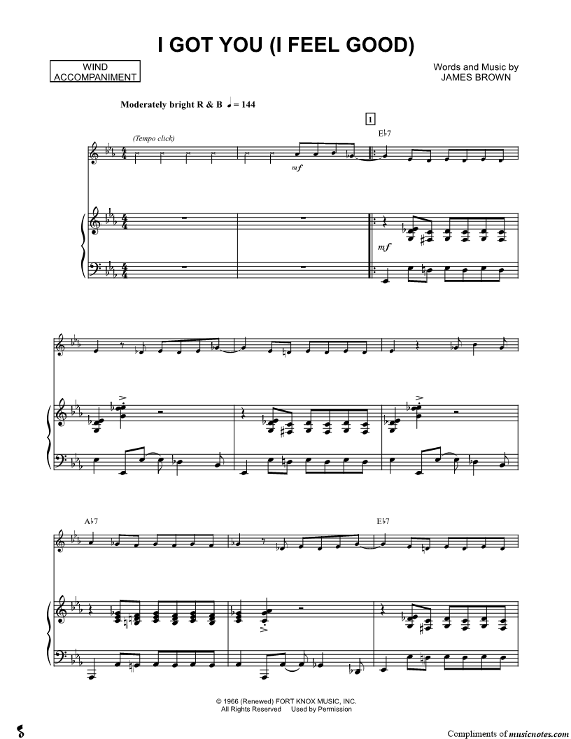 1. I Got You (I Feel Good) - Piano Accompaniment (Winds) (click here to preview and play this piece) Performer: Composer: Lyricist: Scored For:Solo & Accompaniment and Instrumental Part Instruments:Piano Accompaniment, C Instrument, Violin, Oboe, Flute and Recorder Number of pages:4 Click here to purchase this piece separately for $5.99 |