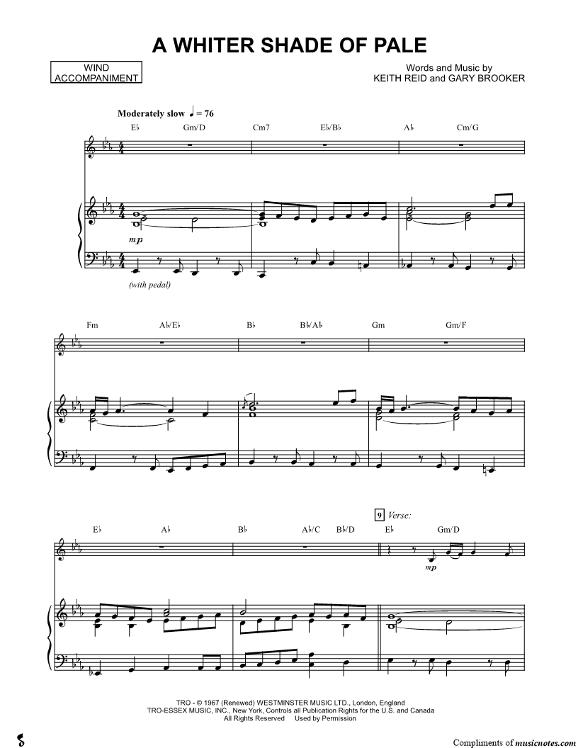 1. A Whiter Shade of Pale - Piano Accompaniment (Winds) (click here to preview and play this piece) Performer: Composers: Lyricists: Scored For:Solo & Accompaniment and Instrumental Part Instruments:Piano Accompaniment, C Instrument, Violin, Oboe, Flute and Recorder Number of pages:4 Click here to purchase this piece separately for $5.99 |
