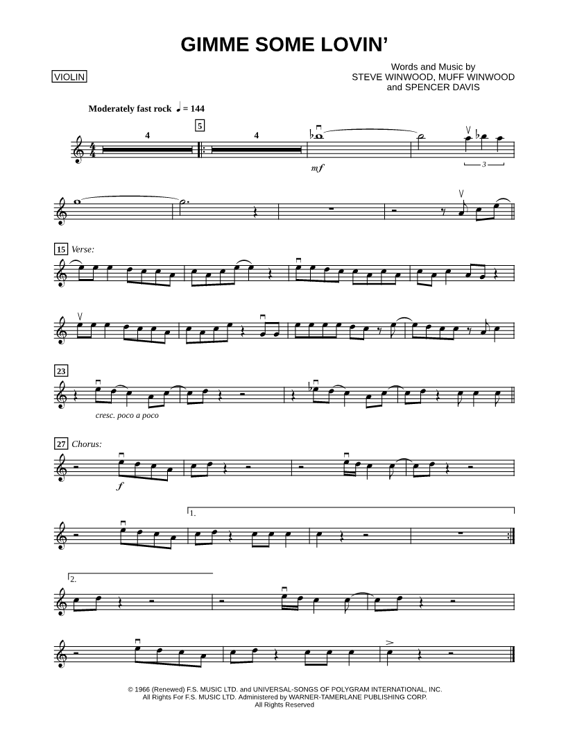 1. Gimme Some Lovin' - Violin (click here to preview and play this piece) Performer: Composers: Lyricists: Scored For:Instrumental Solo Instrument:Violin, range: G4-B5 Number of pages:1 Click here to purchase this piece separately for $4.99 |