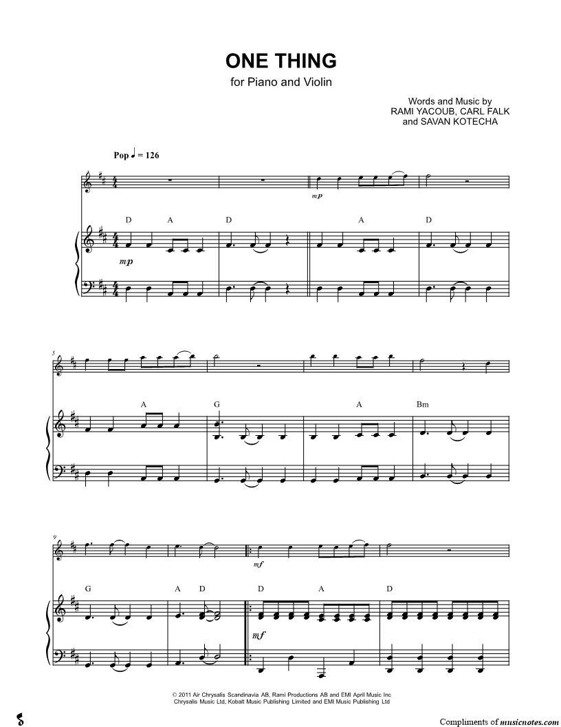 1. One Thing - Piano Accompaniment (Violin) (click here to preview and play this piece) Performer: Composers: Lyricists: Scored For:Solo & Accompaniment and Instrumental Part Instruments:Violin, range: D4-D6 and Piano Accompaniment Number of pages:5 Click here to purchase this piece separately for $5.99 |
