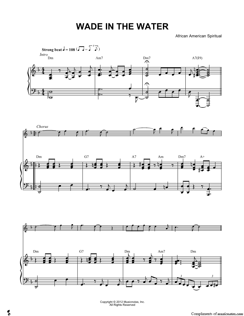 1. Wade In the Water - Piano Accompaniment (click here to preview and play this piece) Composer: Lyricist: Scored For:Solo & Accompaniment and Instrumental Part Instruments:Piano Accompaniment, C Instrument, range: A4-D6, Violin, Oboe, Flute and Recorder Number of pages:2 Click here to purchase this piece separately for $5.99 |