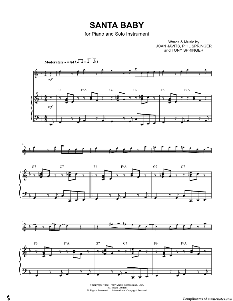 1. Santa Baby - Piano Accompaniment (click here to preview and play this piece) Performers: Composers: Lyricists: Scored For:Solo & Accompaniment and Instrumental Part Instruments:Piano Accompaniment, C Instrument, range: C5-C6, Violin, Oboe, Flute and Recorder Number of pages:4 Click here to purchase this piece separately for $5.99 |