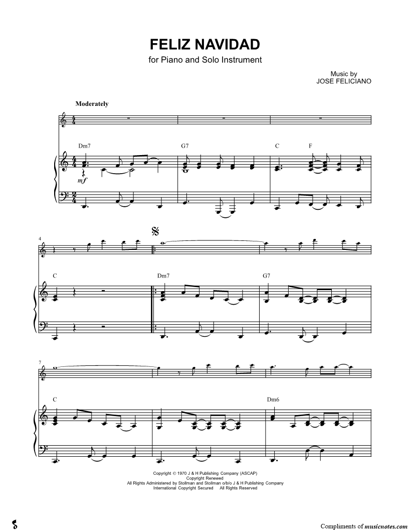 1. Feliz Navidad - Piano Accompaniment (click here to preview and play this piece) Performer: Composer: Lyricist: Scored For:Solo & Accompaniment and Instrumental Part Instruments:Piano Accompaniment, C Instrument, range: E5-E6, Violin, Oboe, Flute and Recorder Number of pages:3 Click here to purchase this piece separately for $5.99 |