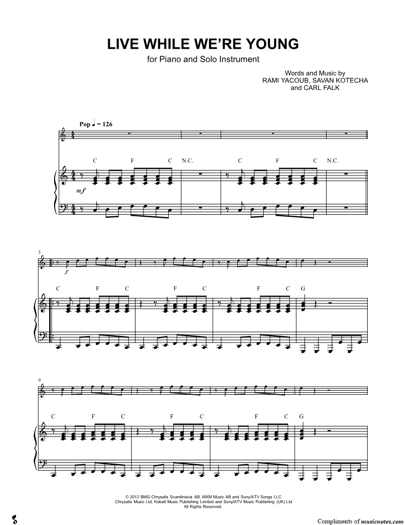 1. Live While We're Young - Piano Accompaniment (click here to preview and play this piece) Performer: Composers: Lyricists: Scored For:Solo & Accompaniment and Instrumental Parts Instruments:Piano Accompaniment, C Instrument, range: G4-E6, Violin, Oboe, Flute and Recorder Number of pages:5 Click here to purchase this piece separately for $5.99 |