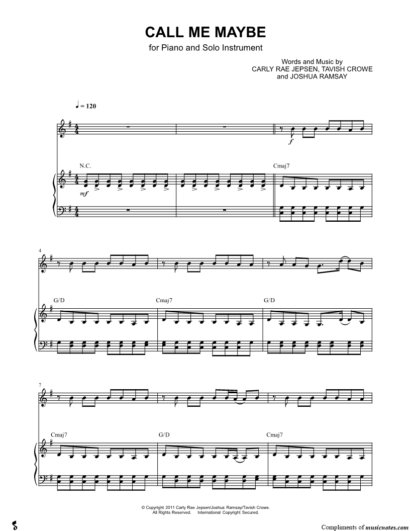 1. Call Me Maybe - Piano Accompaniment (click here to preview and play this piece) Performer: Composers: Lyricists: Scored For:Solo & Accompaniment and Instrumental Part Instruments:Piano Accompaniment and Any Instrument, range: G4-C6 Number of pages:5 Click here to purchase this piece separately for $5.99 |