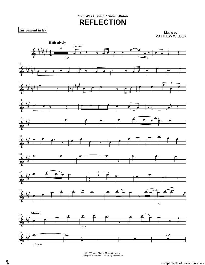 1. Reflection - Eb Instrument (click here to preview and play this piece) Performers: Composer: Lyricist: Scored For:Instrumental Solo and Instrumental Part Instruments:Eb Instrument, range: G#4-D6, Alto Saxophone and Baritone Saxophone Number of pages:1 Click here to purchase this piece separately for $4.99 |