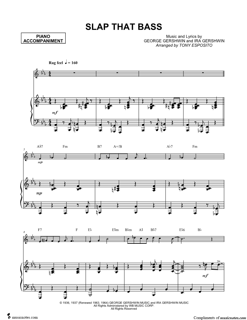 1. Slap That Bass - Piano Accompaniment (click here to preview and play this piece) Composer: Lyricist: Scored For:Solo & Accompaniment Instruments:Piano Accompaniment and Any Instrument, range: Eb4-F5 Number of pages:3 Click here to purchase this piece separately for $5.99 |