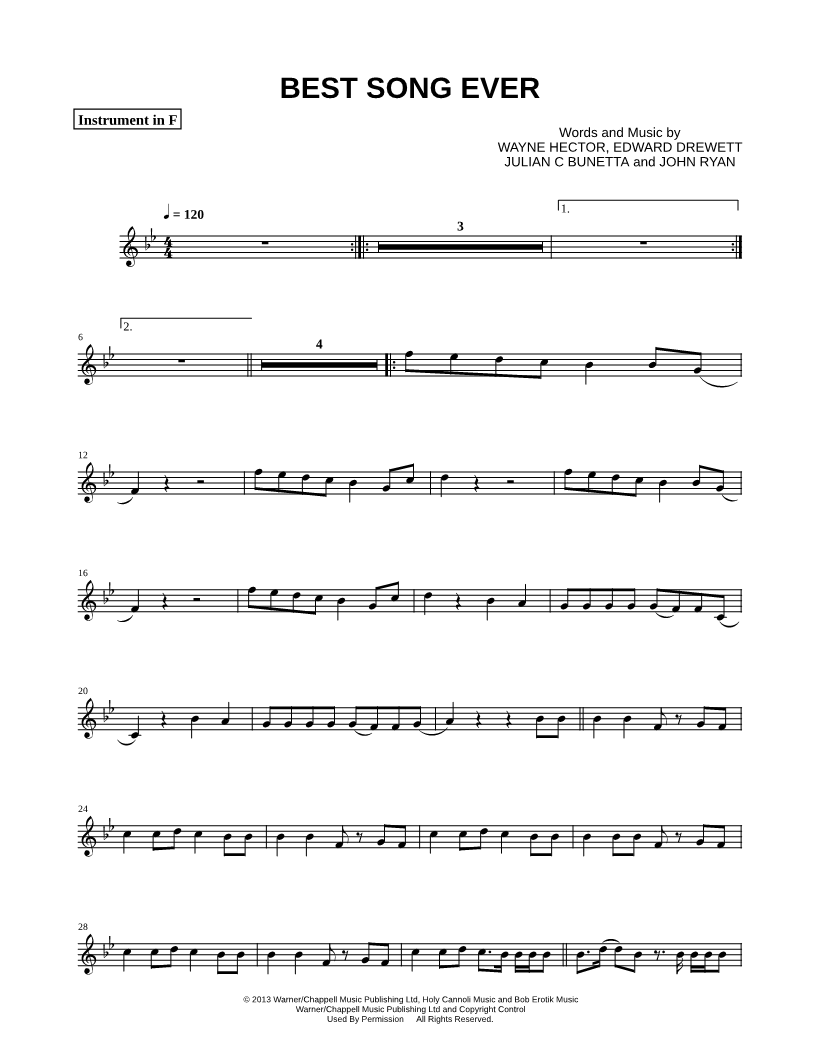 1. Best Song Ever - F Instrument (click here to preview and play this piece) Performer: Composers: Lyricists: Scored For:Instrumental Solo and Instrumental Part Instrument:F Instrument, range: C4-G5 Number of pages:2 Click here to purchase this piece separately for $4.99 |