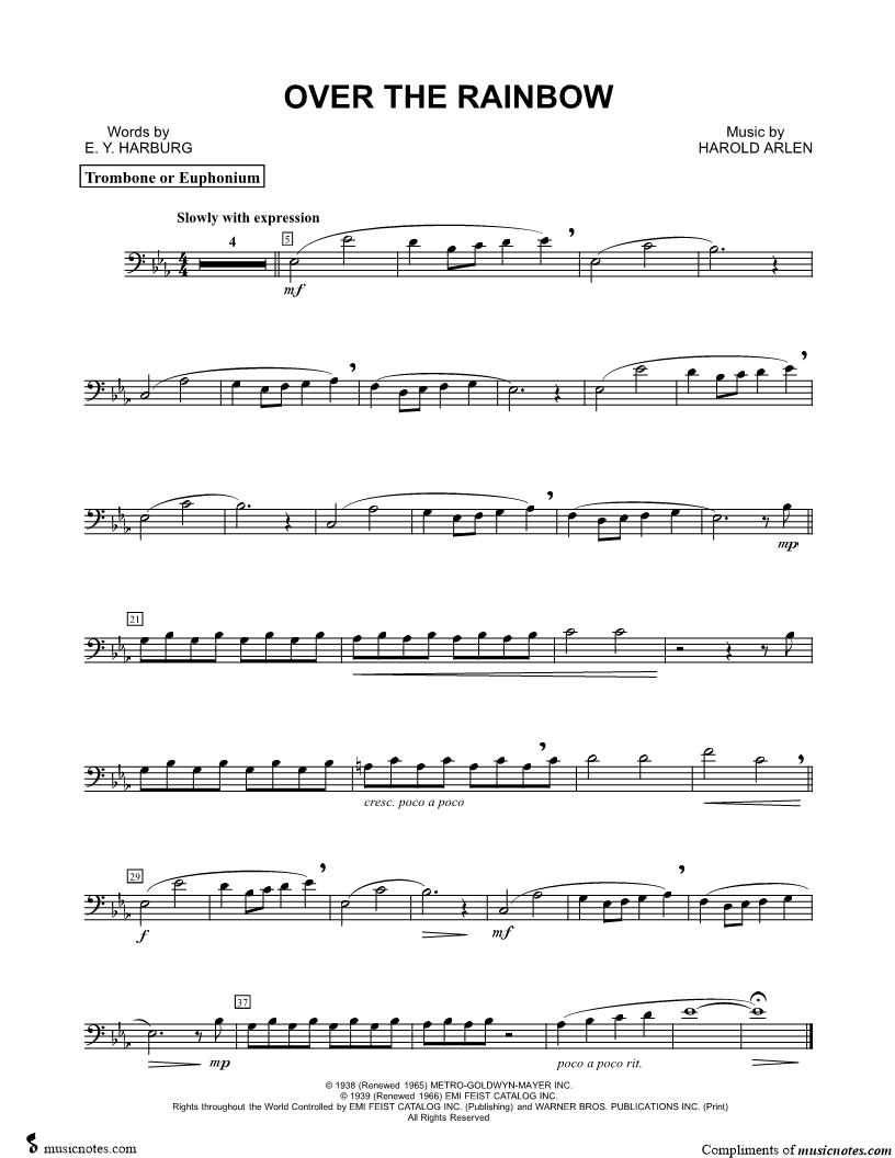 1. Over the Rainbow - Trombone (click here to preview and play this piece) Performer: Composer: Lyricist: Scored For:Instrumental Solo and Instrumental Part Instrument:Trombone, range: C3-F4 or Euphonium Number of pages:1 Click here to purchase this piece separately for $4.99 |