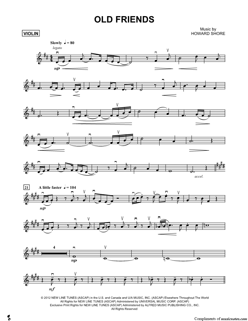 1. Old Friends - Violin (click here to preview and play this piece) Composer: Scored For:Instrumental Solo and Instrumental Part Instrument:Violin, range: C4-E5 Number of pages:2 Click here to purchase this piece separately for $4.99 |