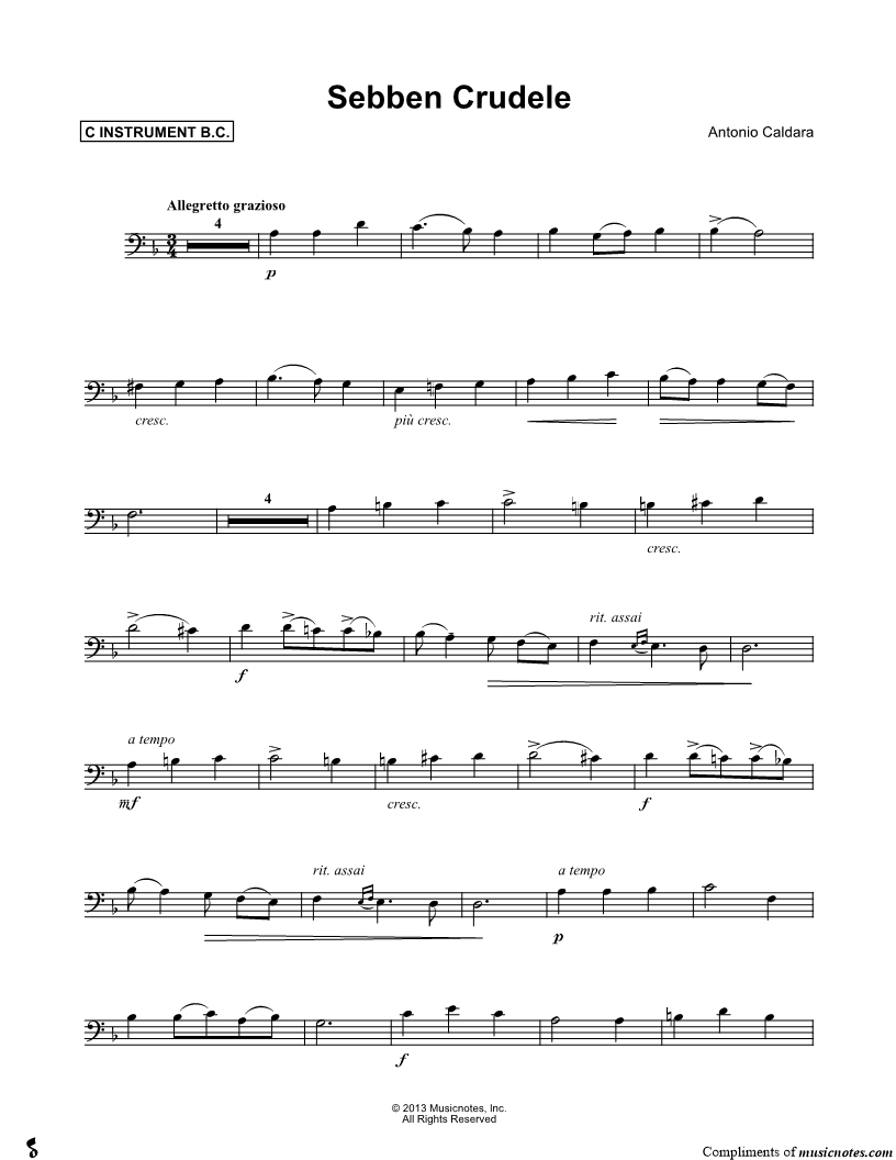 1. Sebben Crudele - Bass Clef Instrument (click here to preview and play this piece) Composer: Scored For:Instrumental Part and Instrumental Solo Instruments:Bass Clef Instrument, Cello, Double Bass, Trombone, Bassoon and Baritone Horn Number of pages:2 Click here to purchase this piece separately for $4.99 |