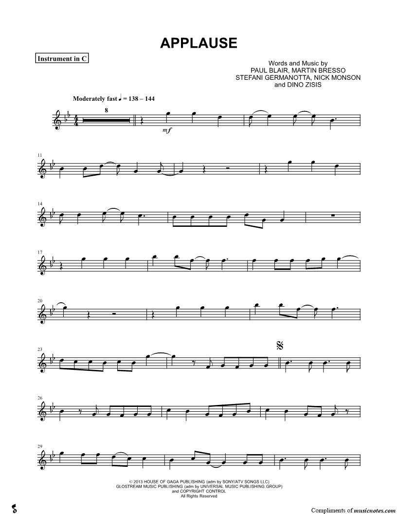 1. Applause - C Instrument (click here to preview and play this piece) Performer: Composers: Lyricists: Scored For:Instrumental Solo and Instrumental Part Instruments:C Instrument, range: F4-D6, Violin, Oboe, Flute and Recorder Number of pages:3 Click here to purchase this piece separately for $4.99 |