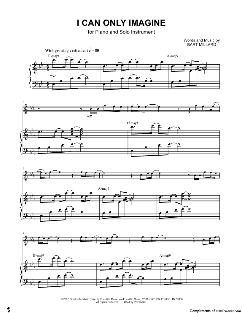 1. I Can Only Imagine - Piano Accompaniment (click here to preview and play this piece) Performer: Composer: Lyricist: Scored For:Solo & Accompaniment and Instrumental Part Instruments:Piano Accompaniment, C Instrument, range: Bb3-C6, Violin, Oboe, Flute and Recorder Number of pages:7 Click here to purchase this piece separately for $5.99 |