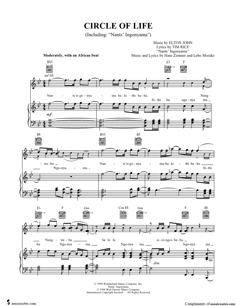 1. Circle of Life / Nants' Ingonyama (click here to preview and play this piece) Performers: Composers: Lyricists: Scored For:Piano/Vocal/Guitar Instruments:Voice, range: C4-Bb5, Piano and Guitar Number of pages:8 Click here to purchase this piece separately for $5.99 |