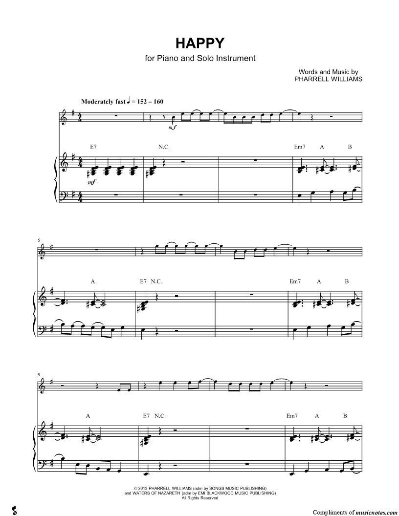 1. Happy - Piano Accompaniment (click here to preview and play this piece) Performer: Composer: Lyricist: Scored For:Solo & Accompaniment and Instrumental Parts Instruments:Piano Accompaniment, C Instrument, range: E4-B5, Violin, Oboe, Flute and Recorder Number of pages:6 Click here to purchase this piece separately for $5.99 |