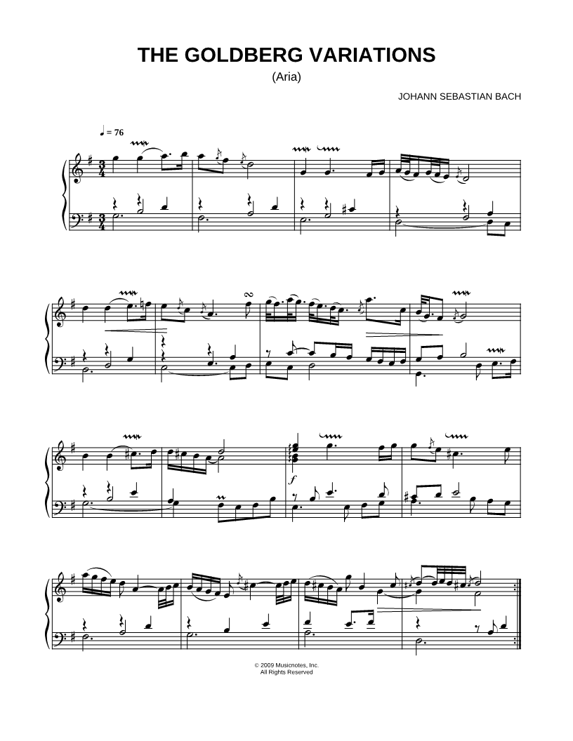 1. The Goldberg Variations, BWV 988: Aria (click here to preview and play this piece) Composer: Scored For:Instrumental Solo Instrument:Piano Number of pages:2 Click here to purchase this piece separately for $5.99 |