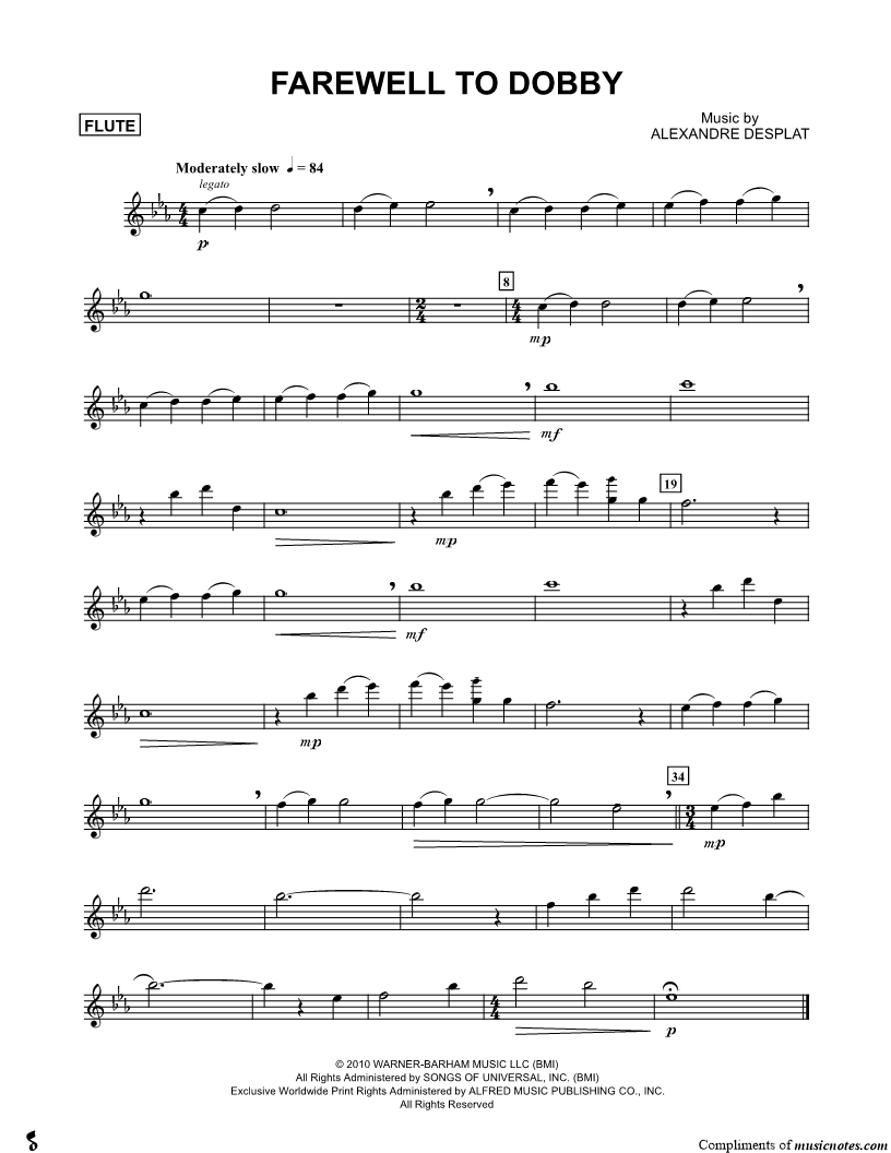 1. Farewell to Dobby - Flute (click here to preview and play this piece) Composer: Scored For:Instrumental Solo and Instrumental Part Instrument:Flute, range: C5-F6 Number of pages:1 Click here to purchase this piece separately for $4.99 |