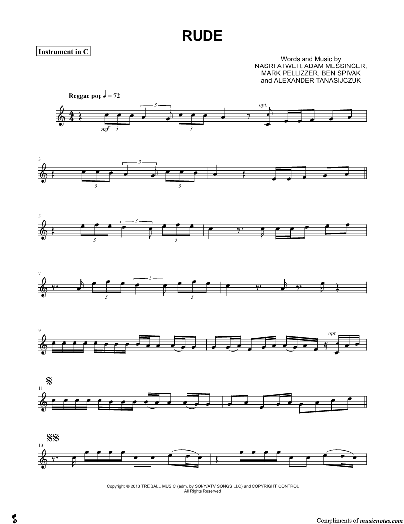 2. Rude - Piano Accompaniment (click here to preview and play this piece) Performer: Composers: Lyricists: Scored For:Instrumental Part and Solo & Accompaniment Instruments:Piano Accompaniment, C Instrument, range: C4-G5, Violin, Oboe, Flute and Recorder Number of pages:6 Click here to purchase this piece separately for $5.99 |