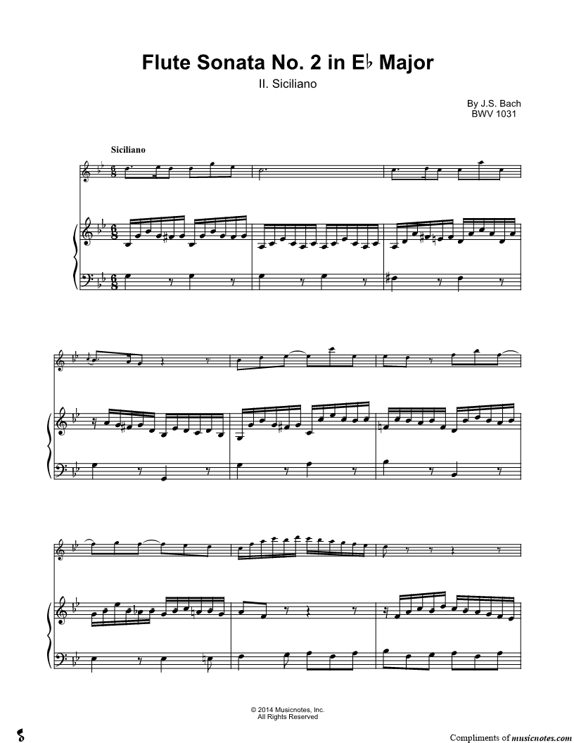 1. Flute Sonata No. 2 in Eb Major: II. Siciliano - Piano Accompaniment (click here to preview and play this piece) Composer: Scored For:Solo & Accompaniment and Instrumental Part Instruments:Piano Accompaniment and Flute, range: D4-D6 Number of pages:3 Click here to purchase this piece separately for $5.99 |