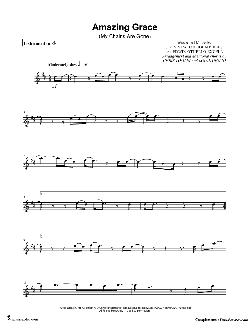 1. Amazing Grace (My Chains Are Gone) - Eb Instrument (click here to preview and play this piece) Performer: Composers: Lyricists: Scored For:Instrumental Part and Instrumental Solo Instruments:Eb Instrument, range: A4-D6, Alto Saxophone and Baritone Saxophone Number of pages:3 Click here to purchase this piece separately for $4.99 |