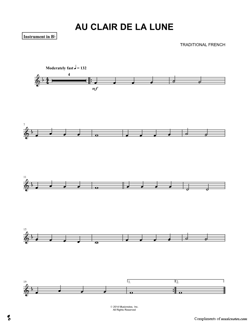 1. Au Clair de la Lune - Bb Instrument (click here to preview and play this piece) Composer: Lyricist: Scored For:Instrumental Solo and Instrumental Part Instruments:Bb Instrument, range: C4-A4, Trumpet, Soprano Saxophone, Tenor Saxophone and Clarinet Number of pages:1 Click here to purchase this piece separately for $4.99 |