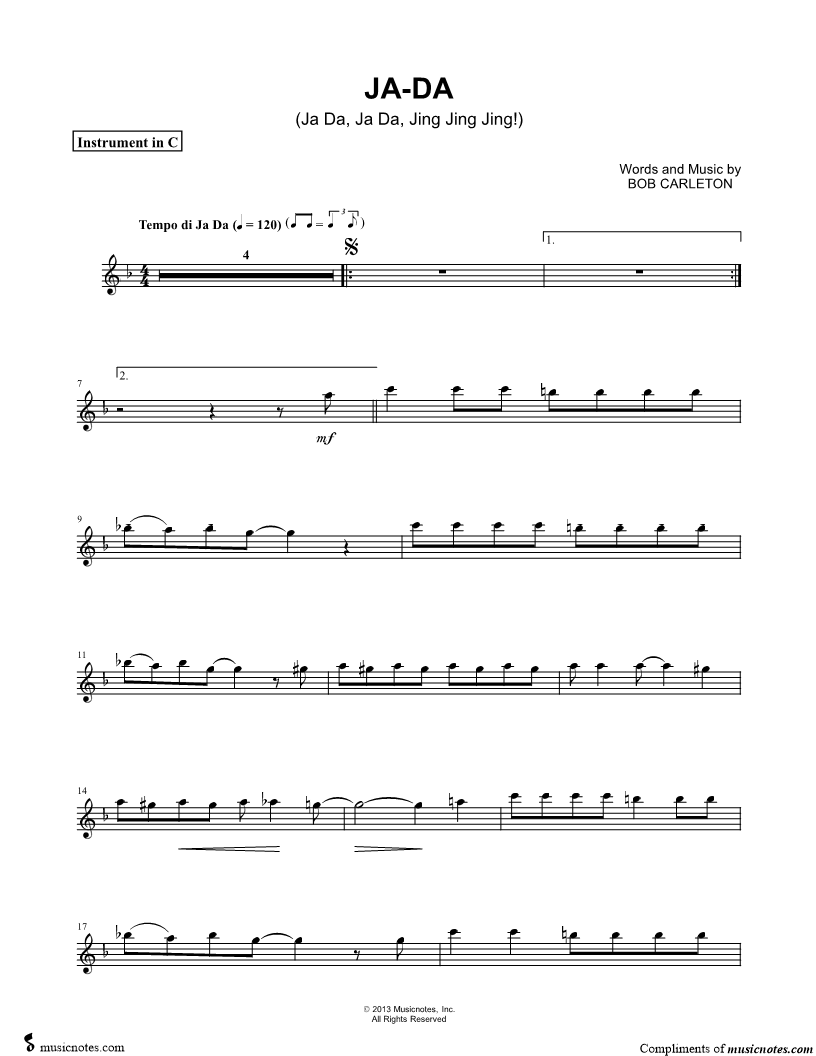 1. Ja-Da - C Instrument (click here to preview and play this piece) Composer: Lyricist: Scored For:Instrumental Solo and Instrumental Part Instruments:C Instrument, range: F5-D6, Violin, Oboe, Flute and Recorder Number of pages:2 Click here to purchase this piece separately for $4.99 |