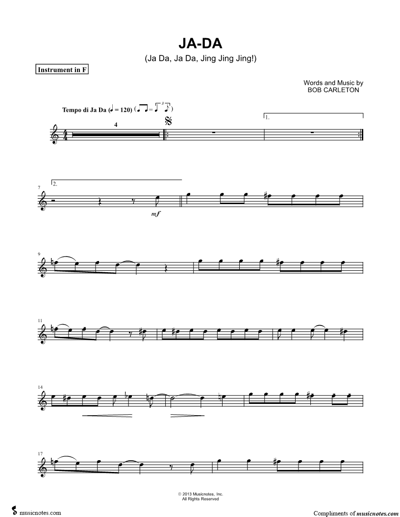 1. Ja-Da - F Instrument (click here to preview and play this piece) Composer: Lyricist: Scored For:Instrumental Solo and Instrumental Part Instrument:F Instrument, range: C5-A5 Number of pages:2 Click here to purchase this piece separately for $4.99 |