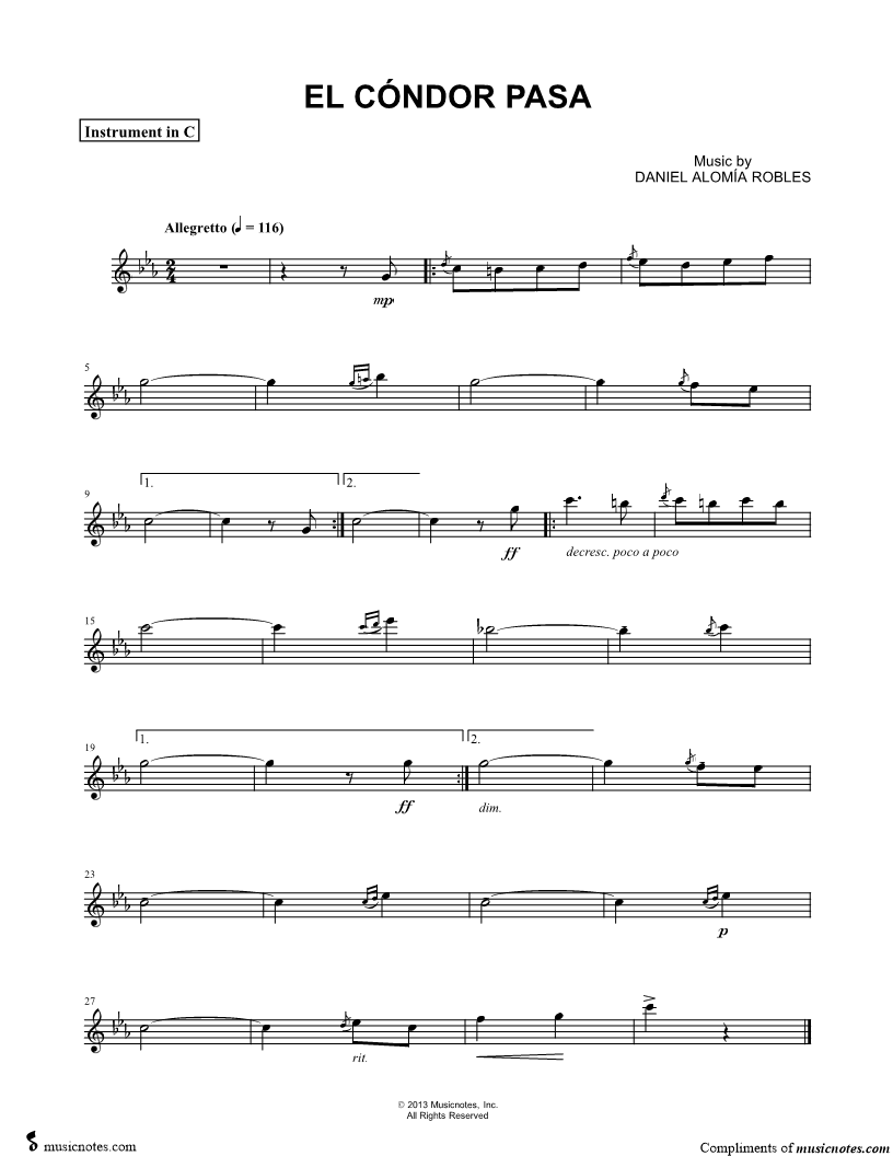 1. El Cóndor Pasa - C Instrument (click here to preview and play this piece) Composer: Scored For:Instrumental Solo and Instrumental Part Instruments:C Instrument, range: G4-Eb6, Violin, Oboe, Flute and Recorder Number of pages:1 Click here to purchase this piece separately for $4.99 |