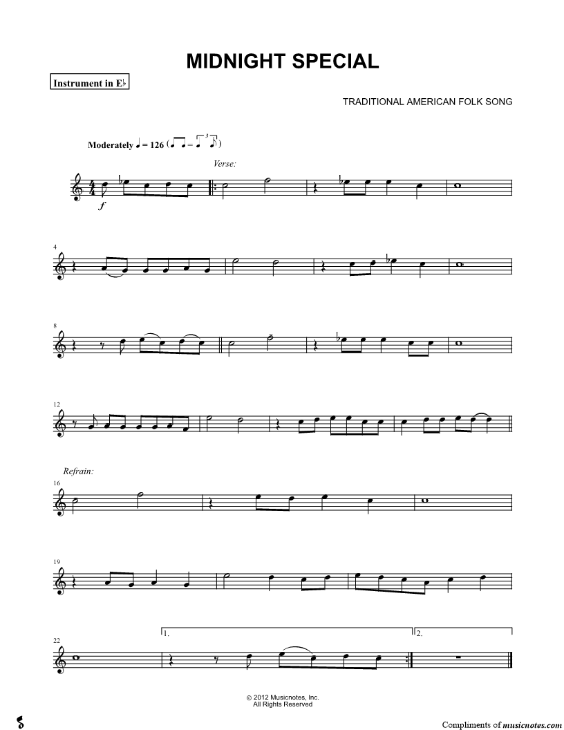 1. The Midnight Special - Eb Instrument (click here to preview and play this piece) Performer: Composer: Lyricist: Scored For:Instrumental Solo and Instrumental Part Instruments:Eb Instrument, Alto Saxophone and Baritone Saxophone Number of pages:1 Click here to purchase this piece separately for $4.99 |