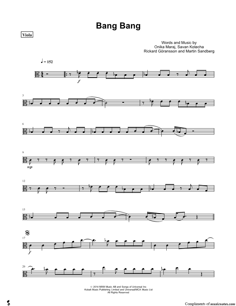 1. Bang Bang - Viola (click here to preview and play this piece) Performers: Composers: Lyricists: Scored For:Instrumental Solo and Instrumental Part Instrument:Viola, range: Eb3-E5 Number of pages:3 Click here to purchase this piece separately for $4.99 |