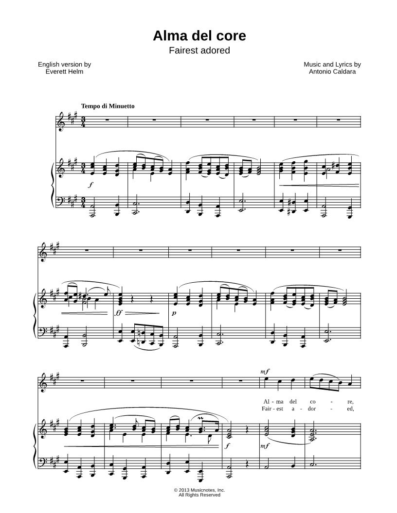 1. Alma del core (click here to preview and play this piece) Composer: Lyricist: Scored For:Piano/Vocal/Chords and Singer Pro Instruments:Voice, range: A4-G#5 and Piano Number of pages:5 Click here to purchase this piece separately for $5.99 |