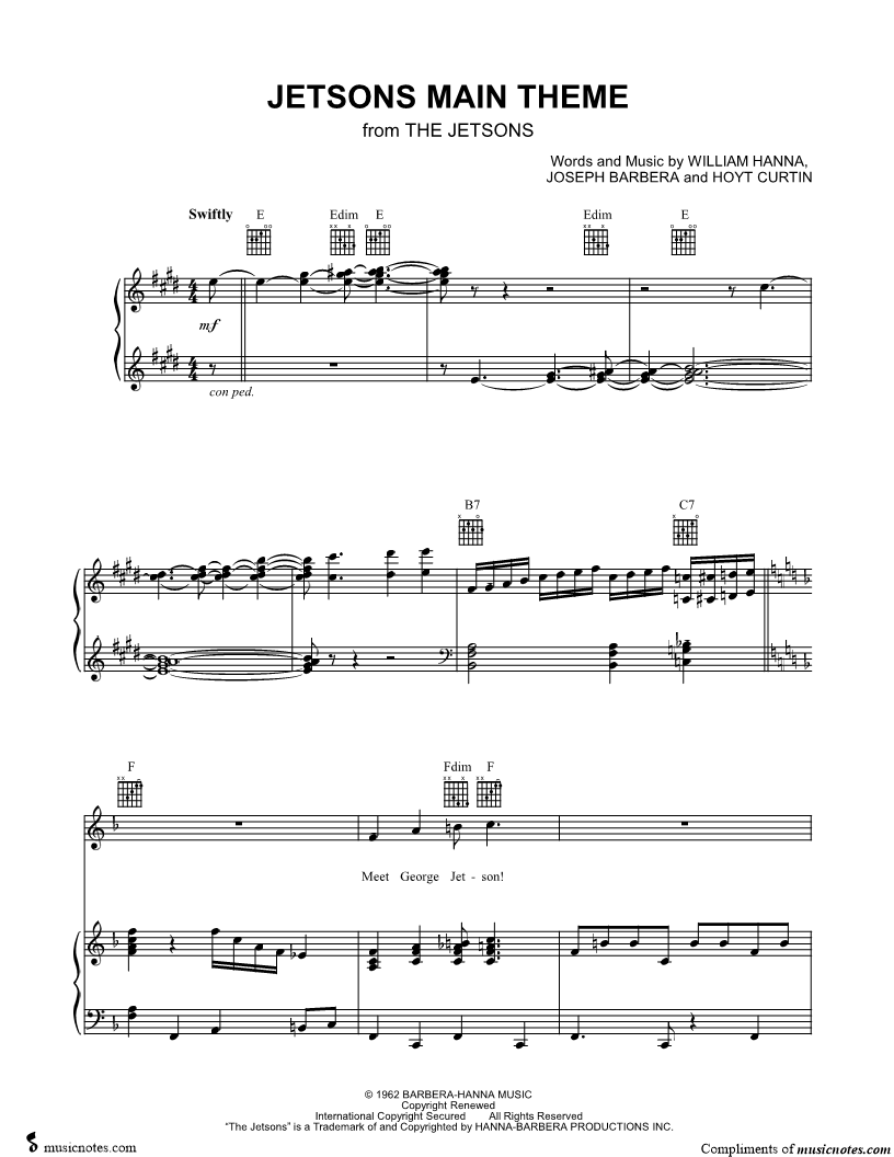 1. The Jetsons Main Theme (click here to preview and play this piece) Composers: Lyricists: Scored For:Piano/Vocal/Guitar Instruments:Voice, range: F4-Eb5, Piano and Guitar Number of pages:3 Click here to purchase this piece separately for $5.99 |