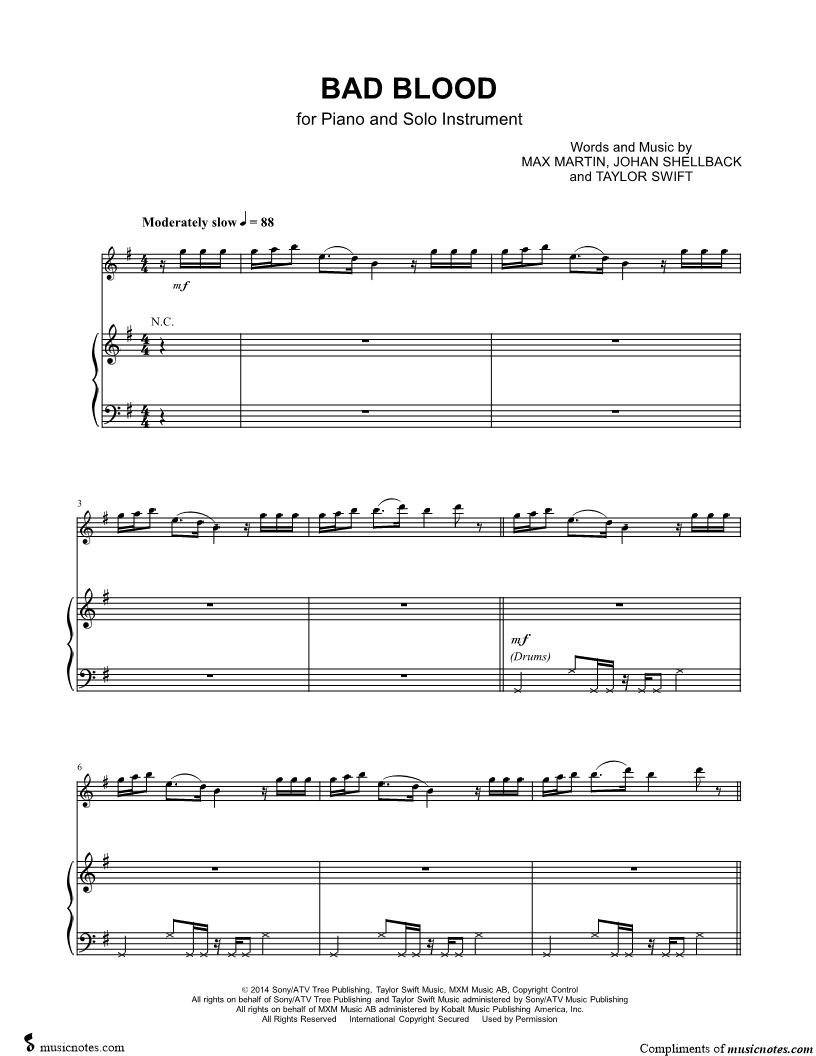 1. Bad Blood - Piano Accompaniment (click here to preview and play this piece) Performer: Composers: Lyricists: Scored For:Solo & Accompaniment and Instrumental Part Instruments:Piano Accompaniment, C Instrument, range: E4-D6, Violin, Oboe, Flute and Recorder Number of pages:5 Click here to purchase this piece separately for $5.99 |