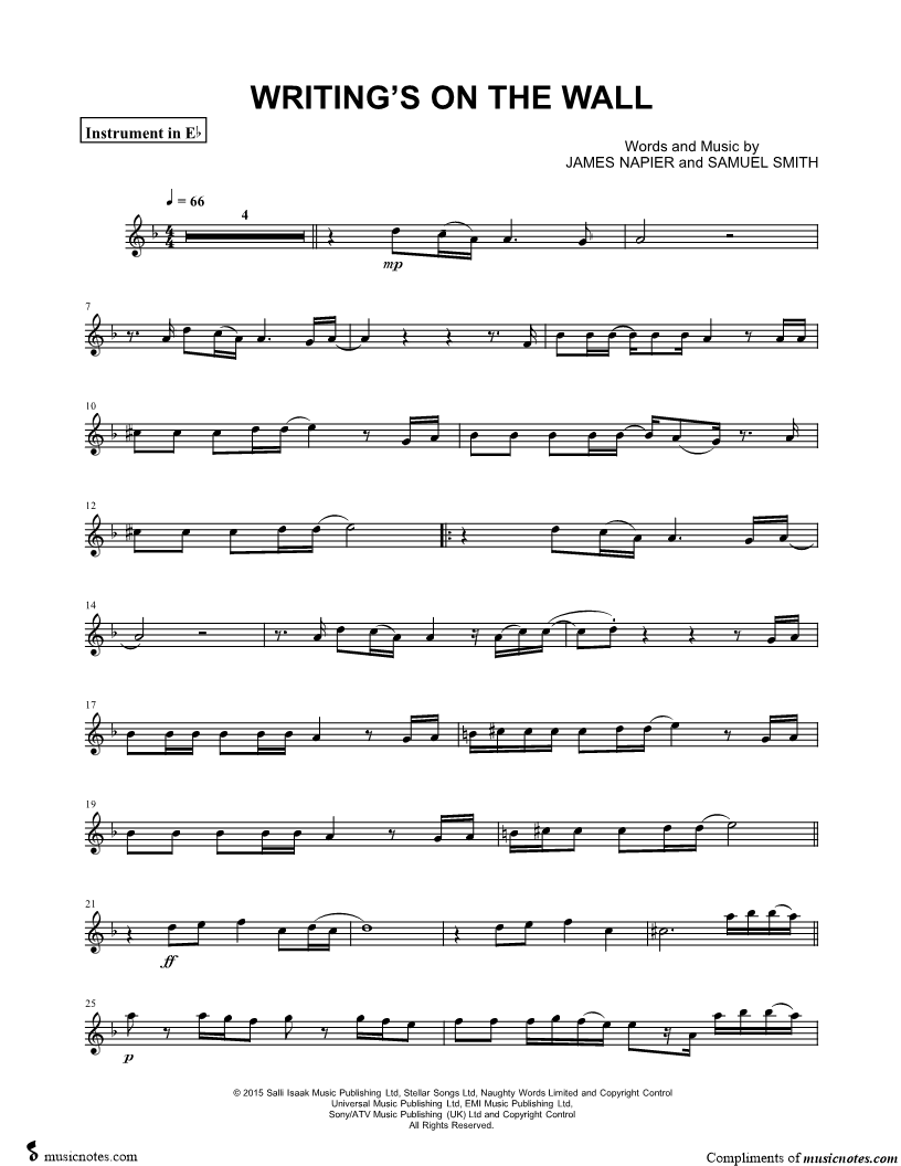 1. Writing's on the Wall - Eb Instrument (click here to preview and play this piece) Performer: Composers: Lyricists: Scored For:Instrumental Solo and Instrumental Part Instruments:Eb Instrument, range: F4-Bb5, Alto Saxophone and Baritone Saxophone Number of pages:2 Click here to purchase this piece separately for $4.99 |
