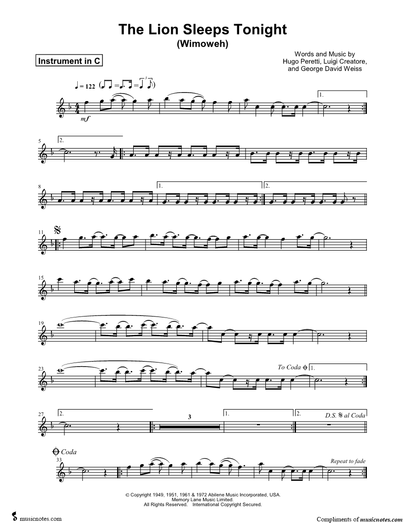 1. The Lion Sleeps Tonight - C Instrument (click here to preview and play this piece) Performer: Composers: Lyricists: Scored For:Instrumental Part and Instrumental Solo Instruments:C Instrument, range: G4-C6, Flute, Violin, Oboe and Recorder Number of pages:1 Click here to purchase this piece separately for $4.99 |