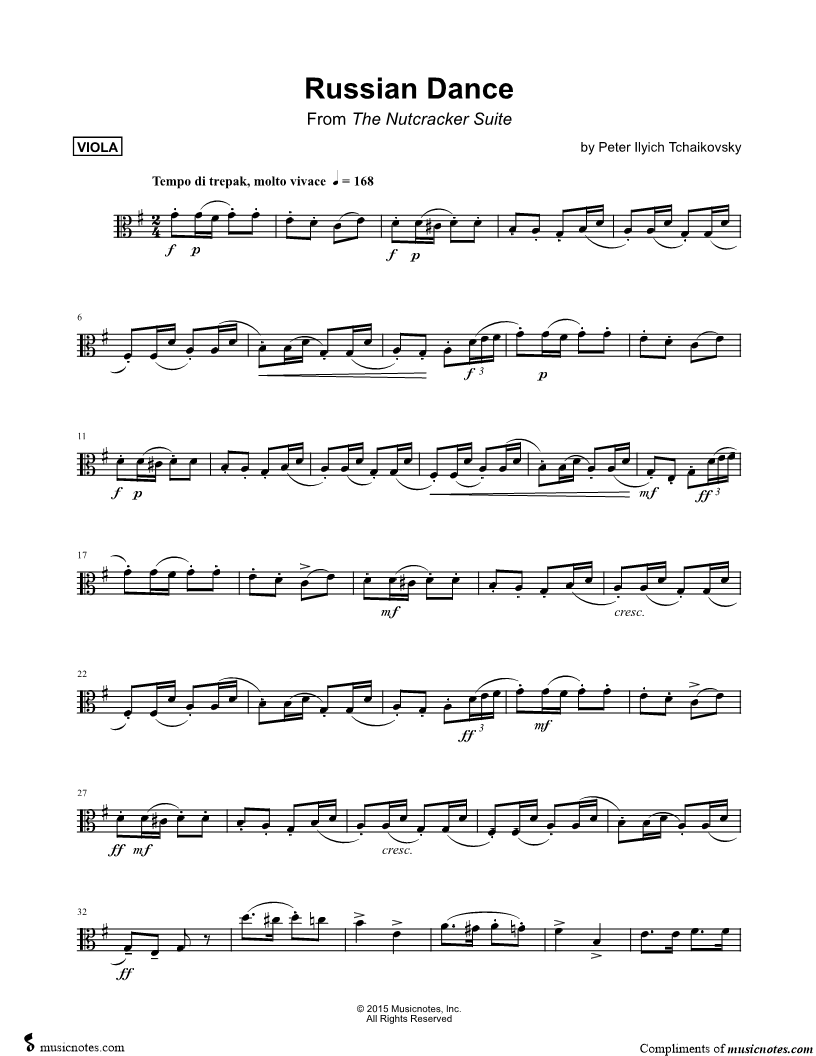 1. Russian Dance - Viola (click here to preview and play this piece) Composer: Scored For:Instrumental Solo and Instrumental Part Instrument:Viola, range: E3-F#5 Number of pages:2 Click here to purchase this piece separately for $4.99 |