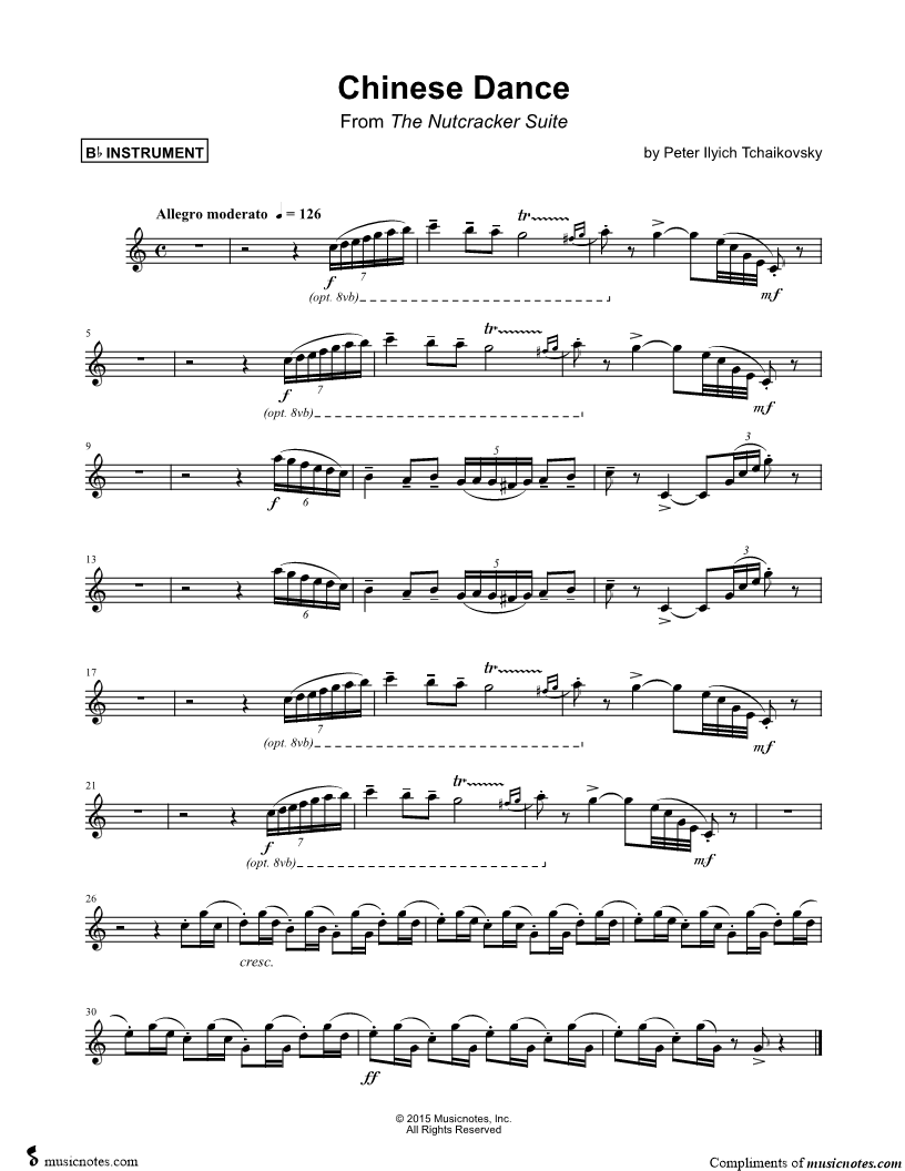 1. Chinese Dance - Bb Instrument (click here to preview and play this piece) Composer: Scored For:Instrumental Solo and Instrumental Part Instruments:Baritone Horn or Euphonium, Bb Instrument, range: C4-C6, Trumpet, Soprano Saxophone, Tenor Saxophone and Clarinet Number of pages:1 Click here to purchase this piece separately for $4.99 |