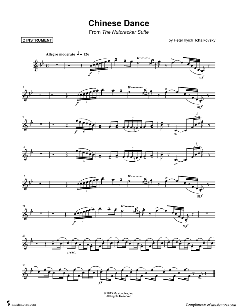 1. Chinese Dance - C Instrument (click here to preview and play this piece) Composer: Scored For:Instrumental Solo and Instrumental Part Instruments:C Instrument, range: Bb3-Bb5, Violin, Oboe, Flute and Recorder Number of pages:1 Click here to purchase this piece separately for $4.99 |